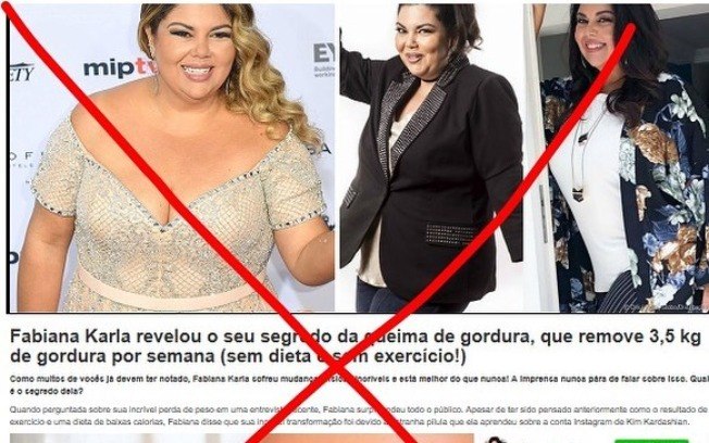 "Recorri ao advogado Ricardo Brajterman, que adotará as medidas judiciais civis e criminais cabíveis contra essa absurda e indevida utilização da minha imagem e nome", iniciou Fabiana Karla , em publicação no Instagram. O remédio associado ao nome de Fabiana Karla promete remover 3.5 kg de gordura por semana sem dieta ou exercícios. Na manchete, a empresa ainda declarou que a atriz revelou seu segredo. confira:
