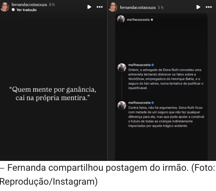 Nesta terça-feira (15), Fernanda publicou stories no Instagram questionando a versão de Dona Ruth, mãe da cantora, apresentada em entrevista ao Fantástico. Em um dos posts, escreveu: “Quem mente por ganância, cai na própria mentira”. Em seguida, compartilhou uma publicação do irmão, Matheus Costa, que alegou haver provas de que informações foram distorcidas por Ruth e seu advogado durante a entrevista.