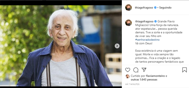 Thiago Fragoso: "Grande Flávio Migliaccio! Uma força da natureza, ator espetacular...Pessoa querida demais. Tive a sorte e a oportunidade de viver seu filho em Senhora do Destino. Vá com Deus! Essa existência é uma viagem sem igual. Morte e vida sempre tão próximas... Fica a criação e o legado de tantos personagens fantásticos que entreteram e comoveram milhões de pessoas."