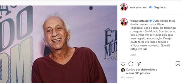 Walcyr Carrasco, autor. "Outra notícia triste do dia: faleceu o ator Flávio Migliaccio, aos 85 anos. Ele trabalhou comigo em Eta Mundo Bom (no ar no Vale a Pena Ver de Novo). Fica aqui meu respeito e admiração. Desejo muita força pra toda a família e amigos nesse momento. Que ele esteja em luz!".