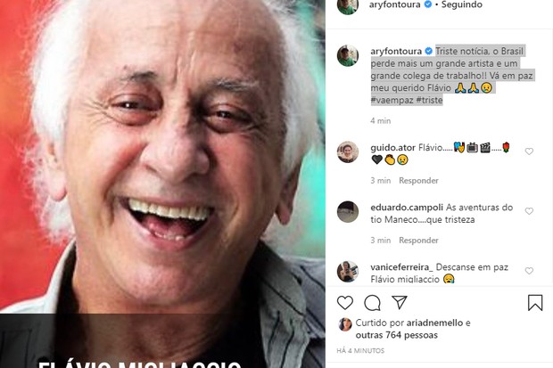 Bianca Bin, atriz: "Flávio Migliaccio: 'Posso representar até os 120 anos'.Flávio é eterno, um mestre. Boa viagem, querido. Continue brilhando daí. Somos gratos por tanto. Triste dia. Ator gigante. Vva Flávio Migliaccio! Viva a sua arte!!! Essa não morre. Nunca. Meus sentimentos aos familiares e amigos.".
