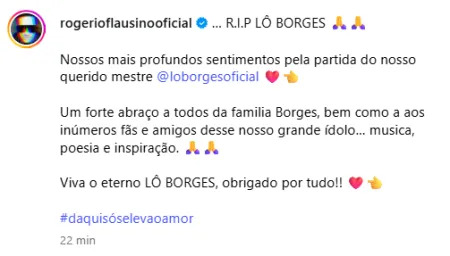 Outro que se manifestou foi Rogério Flausino, vocalista do Jota Quest. “Nossos mais profundos sentimentos pela partida do nosso querido mestre Lô Borges. Um forte abraço à família Borges e a todos os fãs desse grande ídolo. Viva o eterno Lô Borges, obrigado por tudo!”, escreveu o cantor.