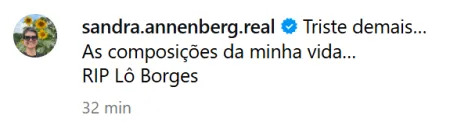 A apresentadora Sandra Annenberg também lamentou a perda: “Triste demais… As composições da minha vida… RIP Lô Borges.”
