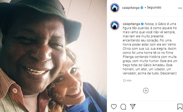 Camila Pitanga, atriz: "Nossa, o Gésio é uma figura tão querida, é como aquele tio mais velho que você não vê sempre, mas tem ele muito presente encantando seu coração. Foi uma honra poder estar com ele em Velho Chico com sua luz, sua alegria. Assim como foi uma honra tê-lo no filme Pitanga contando história com muita graça, com muito humor. Esse era um traço total do Gésio Amadeu. Esse homem, um ator, um lutador, um vencedor, acima de tudo. Descanse!!!"