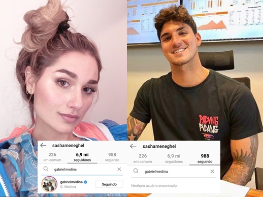 Assim que o boato do suposto término de Sasha Meneghel surgiu, Gabriel Medina logo entrou em ação e já começou seguir a modelo. Todavia, Sasha não correspondeu e não segue o surfista. Apesar de não ter correspondido, os fãs já shipparam.