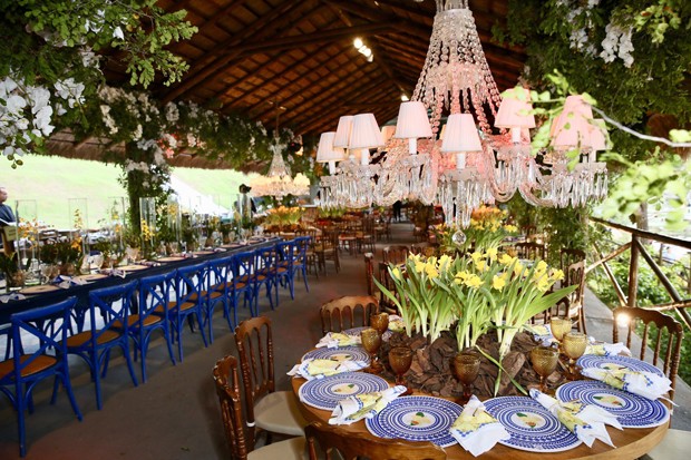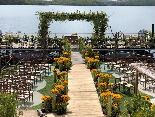 A troca de alianças aconteceu ao pôr do sol. O casamento, para 450 convidados, foi celebrado pelo poeta goiano Júlio César. Já a decoração ficou a cargo de Roni Vieira.