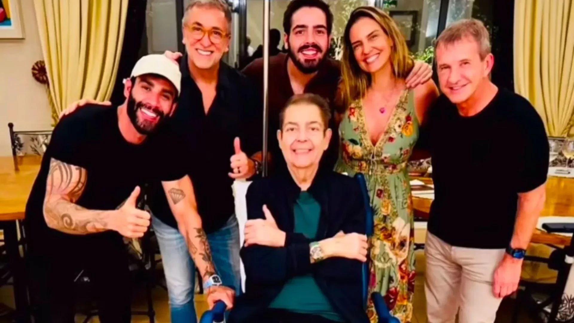 Faustão, de 74 anos, fez uma aparição rara nas redes sociais na manhã desta quinta-feira (27). O registro foi compartilhado pelo jornalista Celso Giunti e traz o apresentador ao lado de sua esposa, Luciana Cardoso, seu filho João Silva, o cantor Gusttavo Lima e o empresário Dody Sirena. Na imagem, Faustão aparece com o pé enfaixado, sentado em uma cadeira de rodas.