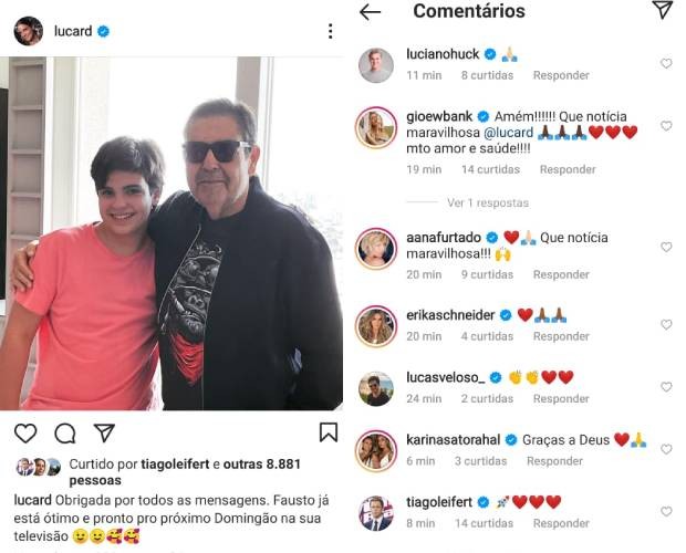 "Obrigada por todas as mensagens. Fausto já está ótimo e pronto para o próximo 'Domingão' na sua televisão", escreveu Luciana na legenda do post, que teve milhares de curtidas.