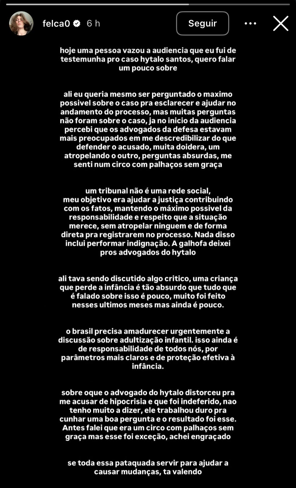 O influenciador digital Felca se manifestou nesta quarta-feira (14) após o vazamento da audiência em que participou como testemunha no processo envolvendo Hytalo Santos. Ele criticou a distorção de seu depoimento e a postura da defesa do acusado durante o interrogatório.