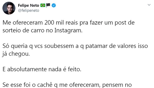 Nesta terça (12), Felipe Neto contou aos seus seguidores que recusou R$ 200 mil para fazer uma postagem para sortear veículo no Instagram.