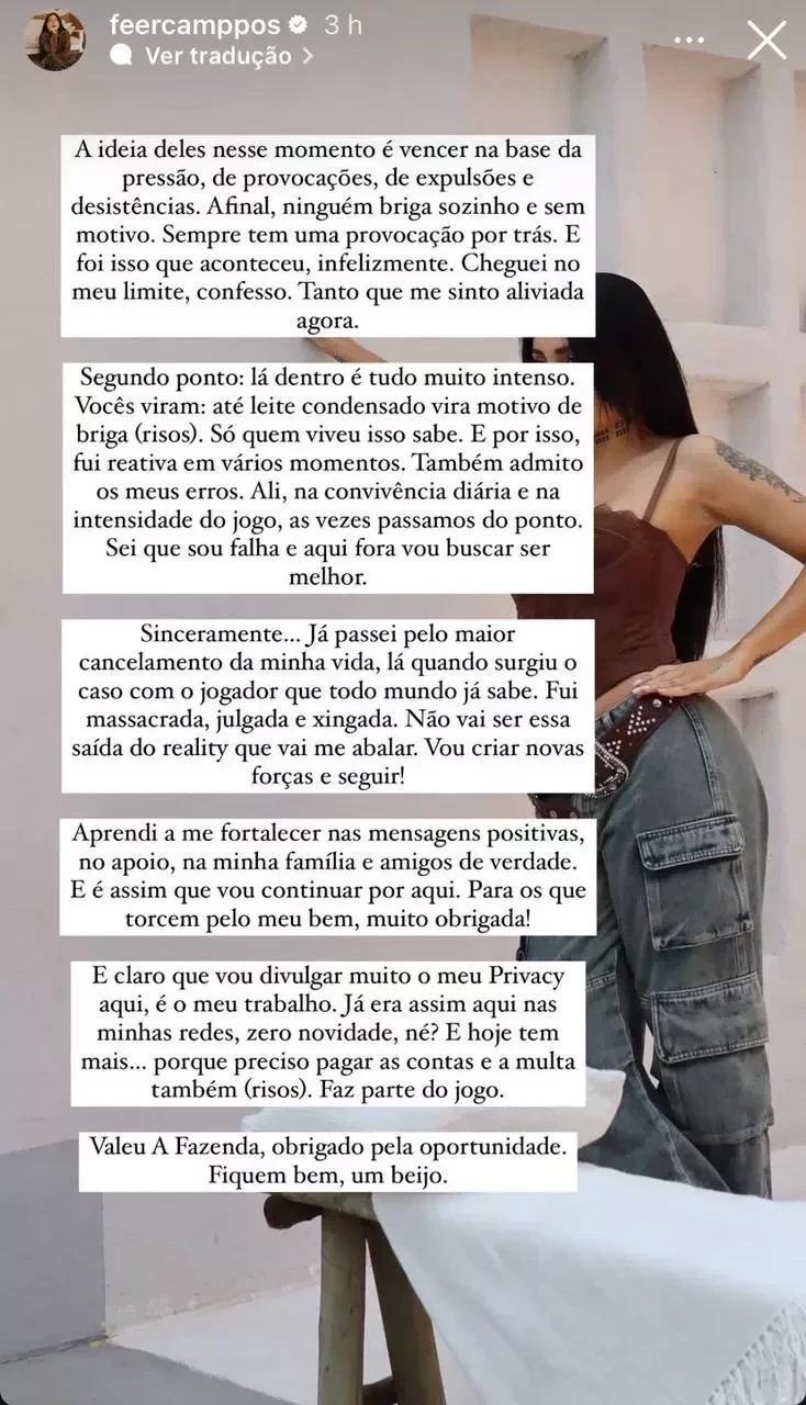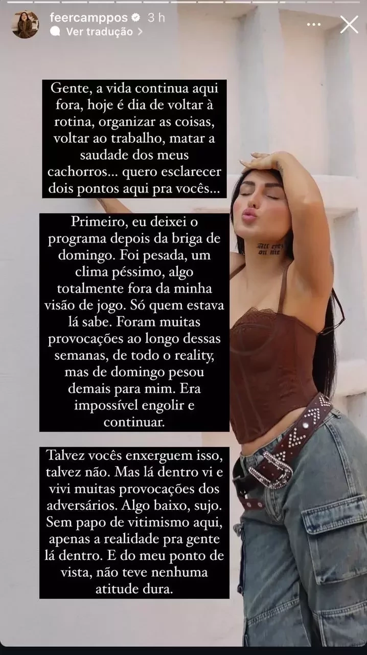 ‘’Eu deixei o programa depois da briga de domingo. Foi pesada, um clima péssimo, algo totalmente fora da minha visão de jogo. Só quem estava lá sabe. Foram muitas provocações ao longo dessas semanas, de todo o reality, mas de domingo pesou demais para mim. Era impossível engolir e continuar’’, iniciou.