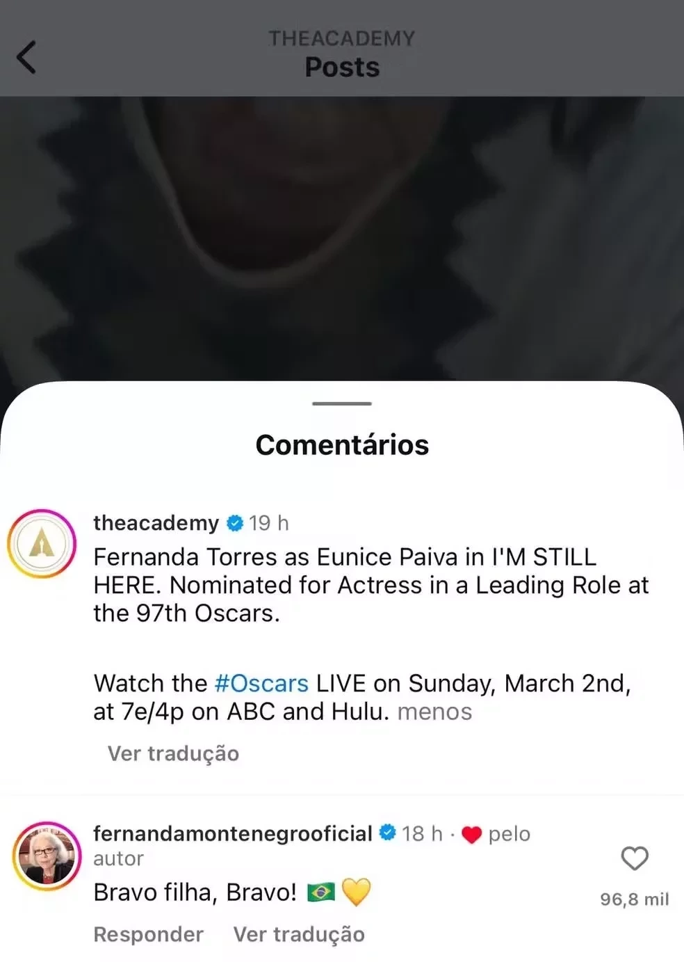 Fernanda Montenegro demonstrou orgulho pela filha, Fernanda Torres, que foi indicada ao Oscar 2025 na categoria de Melhor Atriz pelo filme Ainda Estou Aqui. A veterana deixou um comentário elogiando a performance da atriz no longa de Walter Salles, após o perfil oficial da premiação compartilhar uma cena da produção.