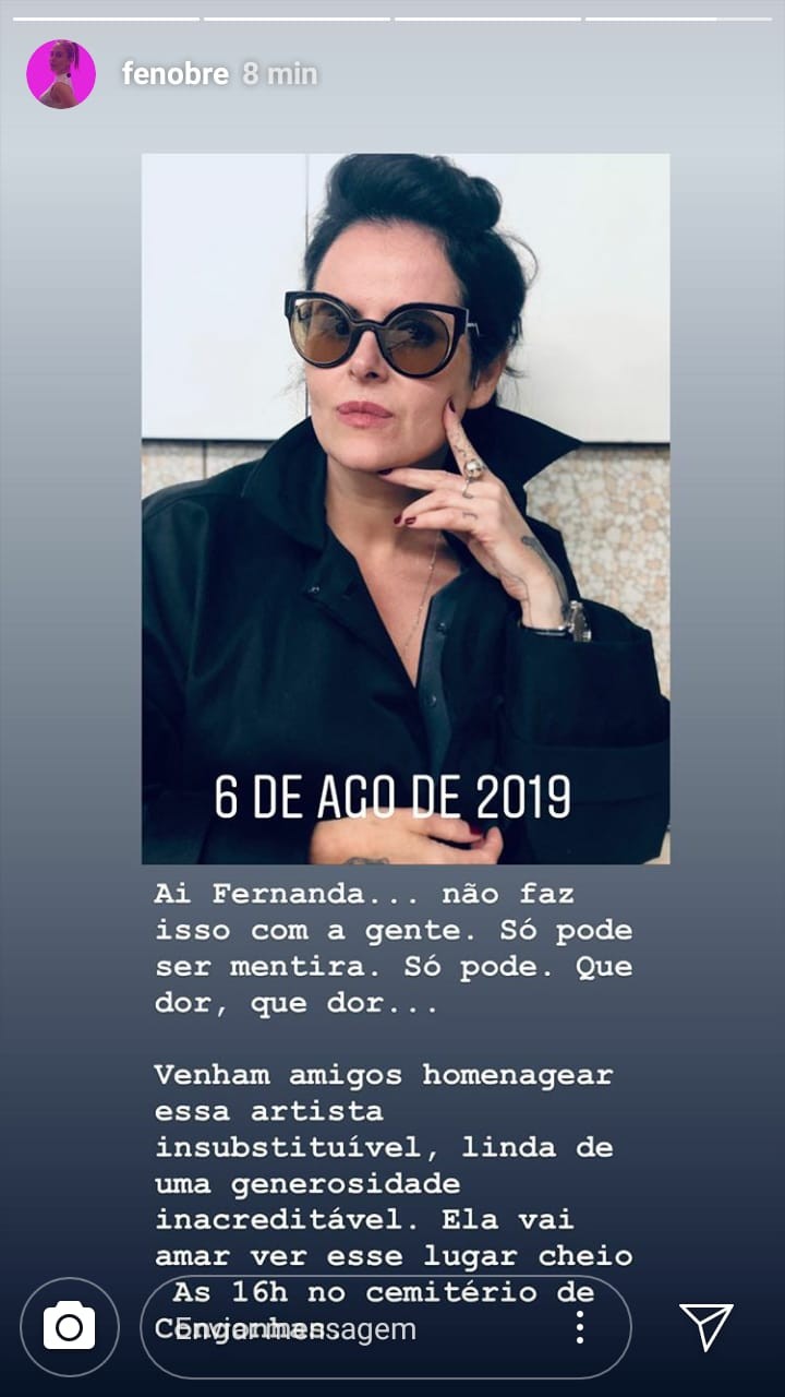 "Ai, Fernanda... Não faz isso com a gente, só pode ser mentira! Só pode! Que dor, que dor! Venham, amigos, homenagear essa artista insbstituível, linda, de uma generosidade inacreditável! Ela vai amar ver esse lugar cheio, às 16h, no cemitério de Congonhas".