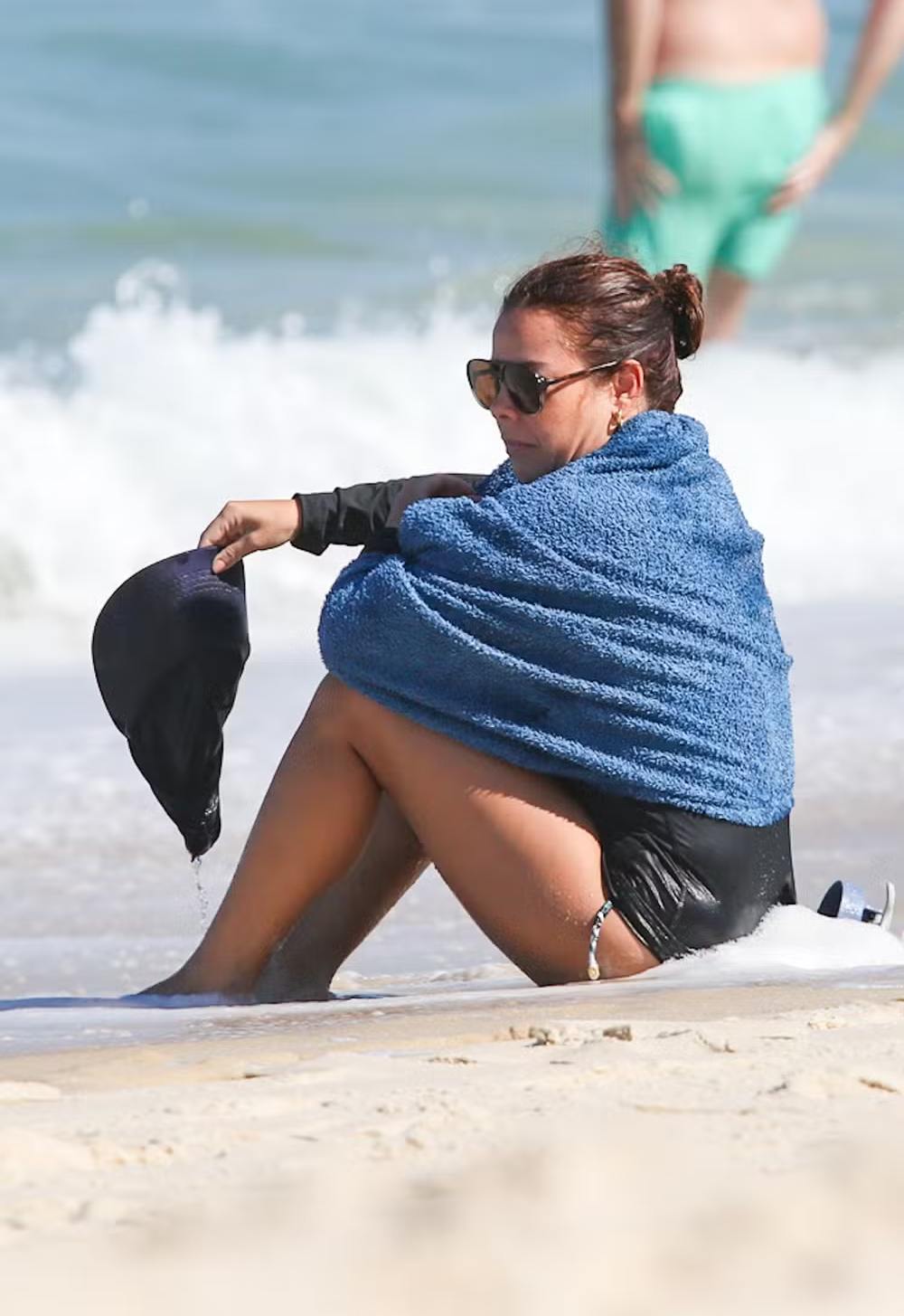 Com óculos escuros e cabelos presos, ela usava uma blusa de proteção UV de mangas longas, por cima do biquíni. Já Eduarda vestia short e camisão listrados de branco e rosa, com camiseta por baixo. Durante o momento de lazer, a atriz relaxou deitada na areia.