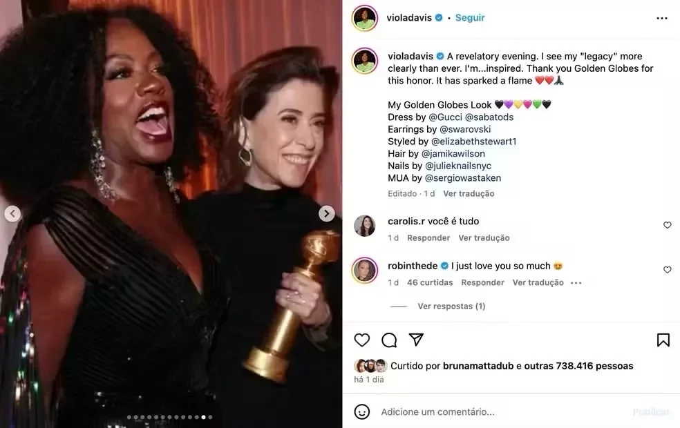 “Uma noite reveladora. Vejo meu ‘legado’ com mais clareza do que nunca. Estou… inspirada. Obrigado, Globos de Ouro, por essa honra. Ela acendeu uma chama”, escreveu a atriz americana ao publicar imagens do evento, incluindo registros nos bastidores ao lado de Fernanda.