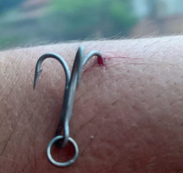 "São muitos anos de pesca, só que tem coisas que acontecem que não tem explicação. A gente sabe que não pode pescar com garatéia, mas a gente acaba vacilando. Eu fui arremessar, ela acabou enroscando na linha de trás e vindo parar no meu braço. Agora bora tirar ali no postinho", contou.