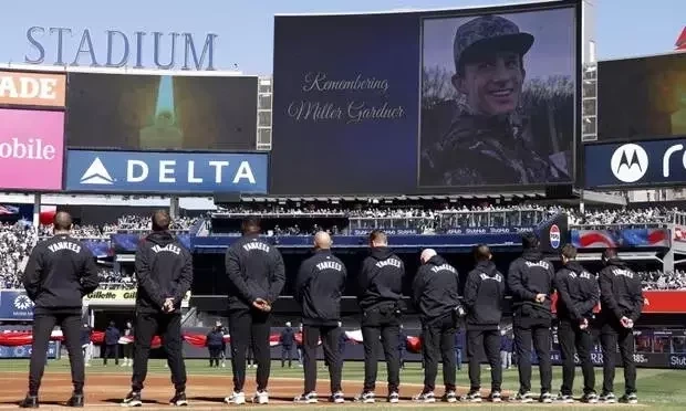 Fãs e jogadores fazem um minuto de silêncio para homenagear Miller Gardner no Yankee Stadium. Fotografia: John Angelillo / UPI / REX / Shutterstock