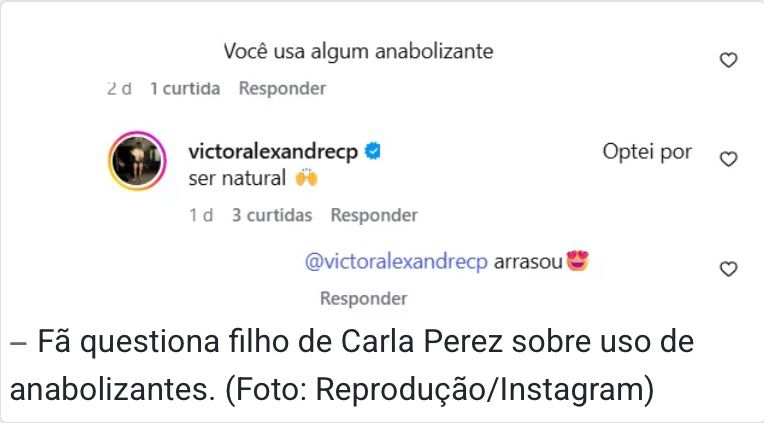Victor Alexandre, filho de Carla Perez e do cantor Xanddy, voltou a repercutir nas redes sociais após publicar novas imagens exibindo o físico definido. Na quinta-feira (4), o atleta foi questionado por seguidores sobre o uso de anabolizantes e decidiu esclarecer o assunto.