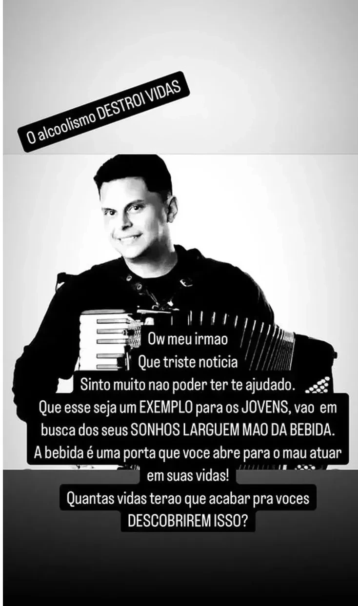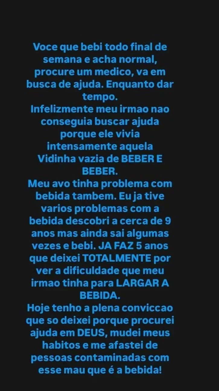 "Você, que bebe todo final de semana e acha normal, procure um médico, vá em busca de ajuda. Enquanto há tempo. Infelizmente, meu irmão não conseguia buscar ajuda porque ele vivia intensamente aquela vidinha vazia de beber e beber", completou.