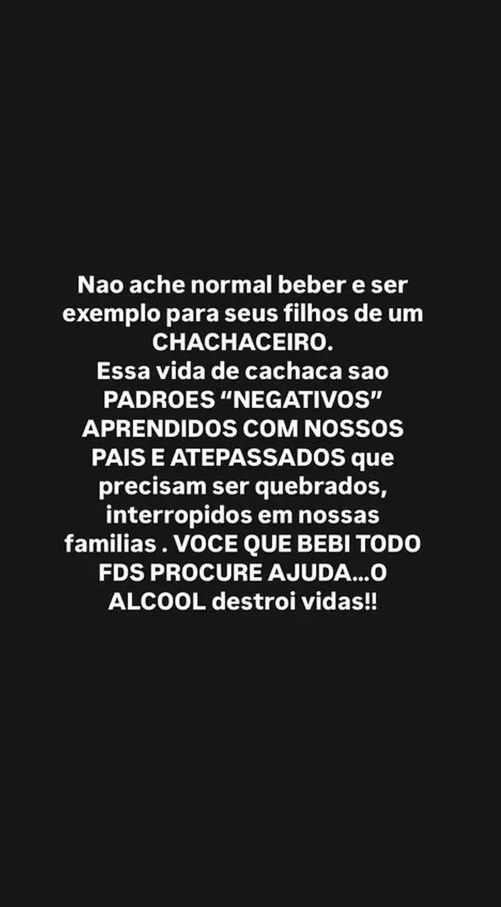 "A bebida é uma porta que você abre para o mal atuar em suas vidas! Quantas vidas terão que acabar para vocês descobrirem isso?", questionou. "Não ache normal beber e ser exemplo para seus filhos de um cachaceiro. Essa vida de cachaça são padrões 'negativos' aprendidos com nossos pais e antepassados que precisam ser quebrados, interrompidos em nossas famílias", disse.