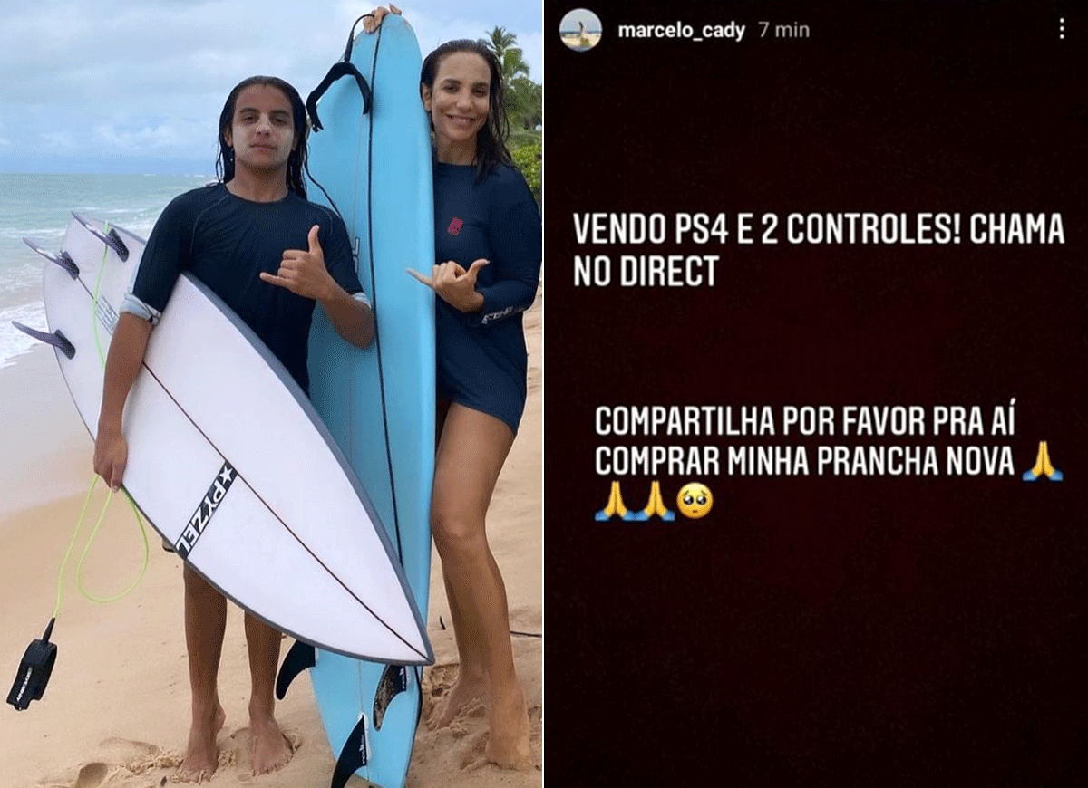 “Vendo PS4 e dois controles! Chama no direct. Compartilha por favor, para aí comprar minha prancha nova”, disse ele na rede social.