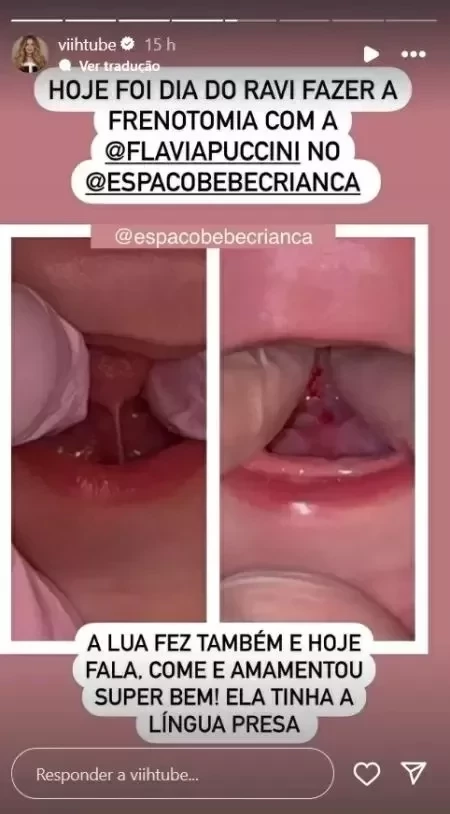“Hoje foi dia do Rav fazer a frenotomia”, escreveu Viih. Ela também relembrou que sua filha mais velha, Lua, realizou a mesma cirurgia e teve bons resultados.