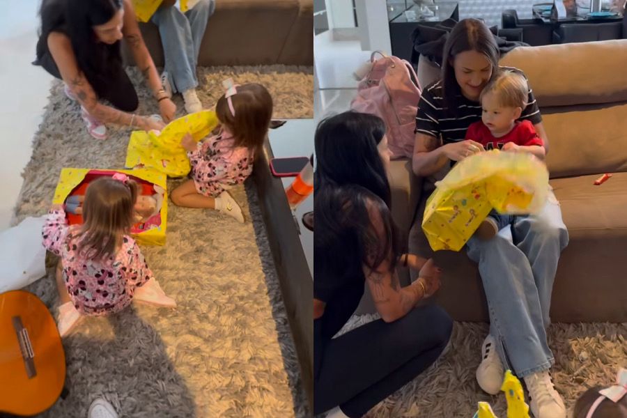 A boiadeira surpreendeu os filhos do ex-casal com brinquedos. No registro, Maria Alice, de 4 anos, e pequena Maria Flor, que completa 3 anos nesta quarta-feira (22), agradecem a “tia Ana” pelo presente. José Leonardo, o caçula da família, também ganhou um presente da cantora.