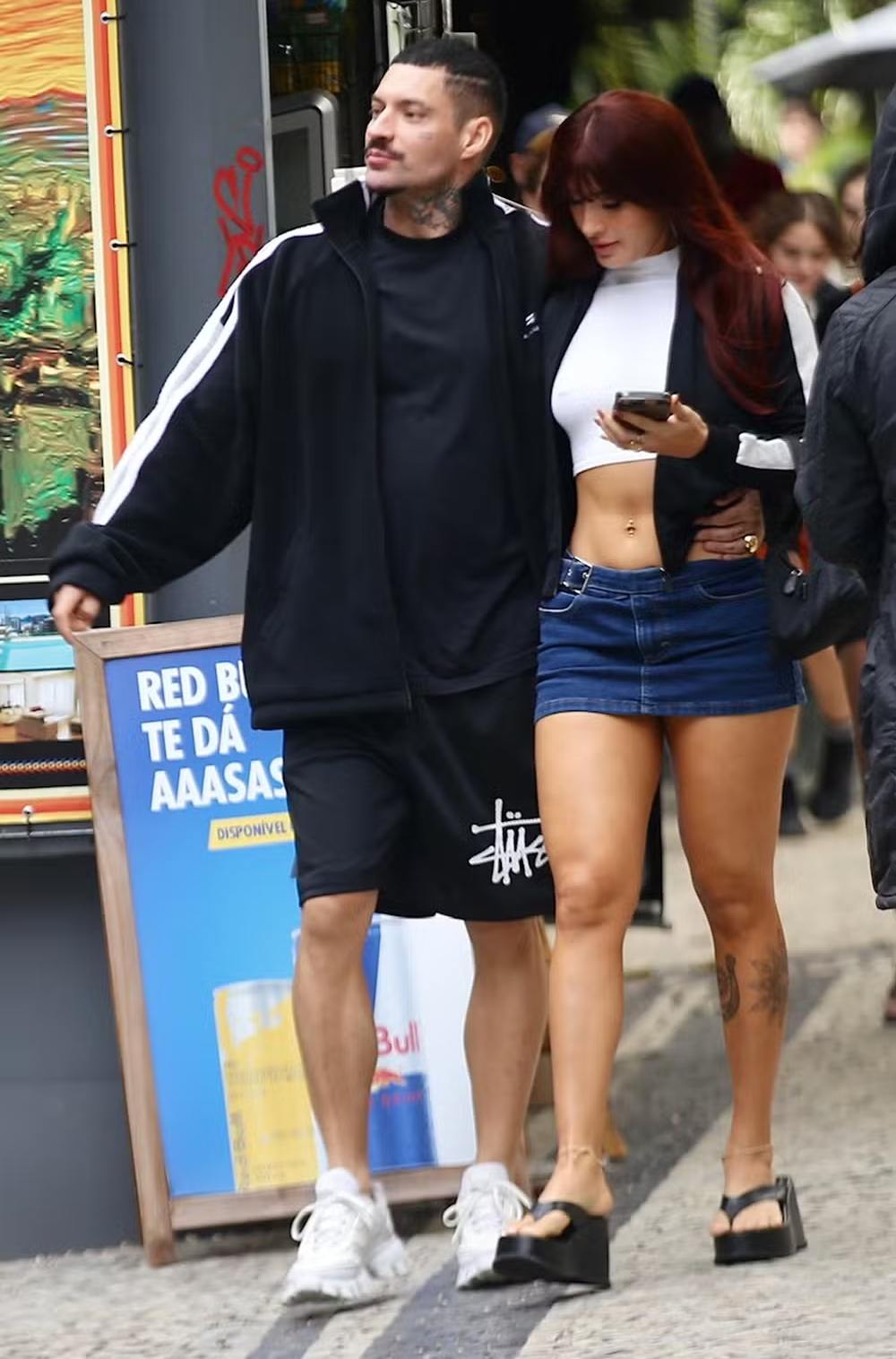 O rapper vestia bermuda e casaco pretos. A influenciadora, por sua vez, apostou em um look despojado e curto, com minishort, moletom, cropped e salto plataforma.