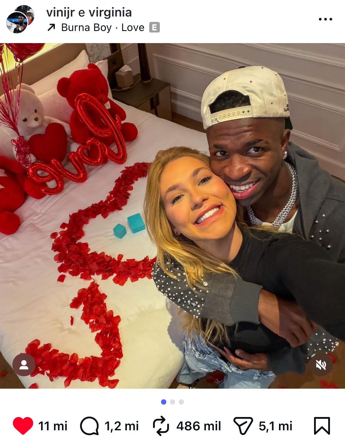 A foto romântica publicada por Vini Jr. para oficializar o namoro com Virginia Fonseca nesta terça-feira (28) viralizou nas redes sociais e já ultrapassou 11 milhões de curtidas. O post, feito de forma compartilhada entre o jogador e a influenciadora, dominou o Instagram.
