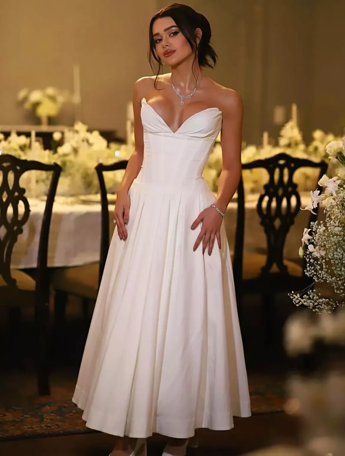 Para a celebração, Franciny apostou em um vestido branco midi da marca House Of CB, combinado com um scarpin branco e joias, algumas presenteadas pelo noivo e outras da designer Marisa Clermann.