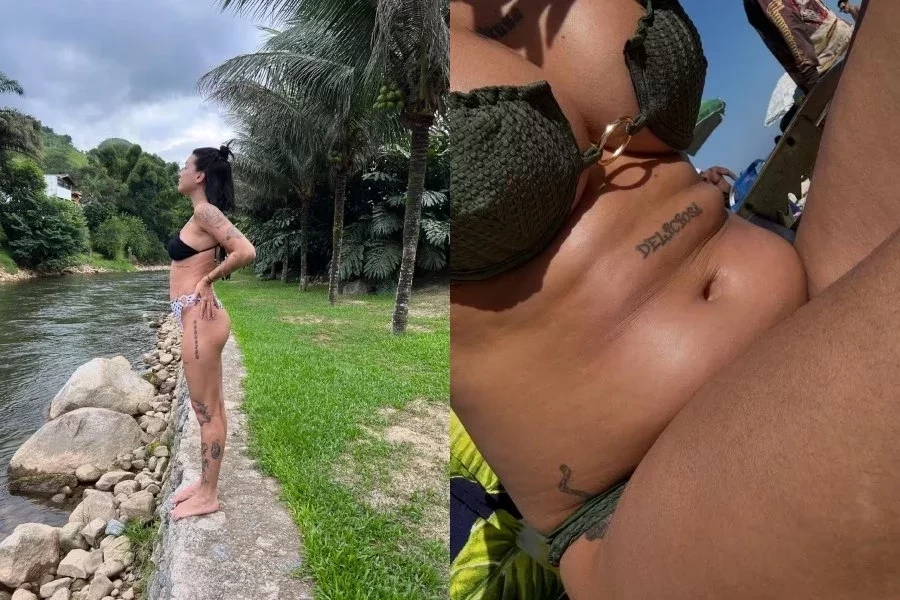 "Hoje eu resolvi falar um pouco sobre o meu corpo... Eu cheguei a pesar 49 kg em 2020. Estava muito doente, no auge da minha depressão e só conseguia ingerir líquidos por uns dois a três meses. Depois, comecei a comer, mas era muito pouco. Na primeira foto, eu pesava 54 kg e achava que nunca passaria disso, pois tive muitos traumas por ser magra demais", declarou.