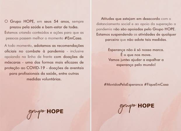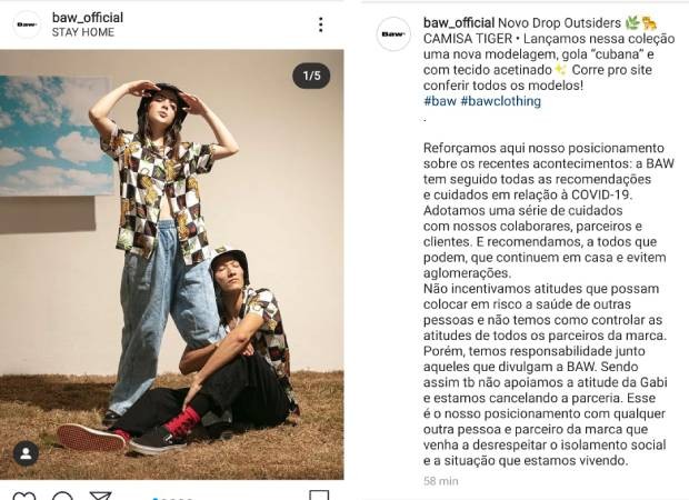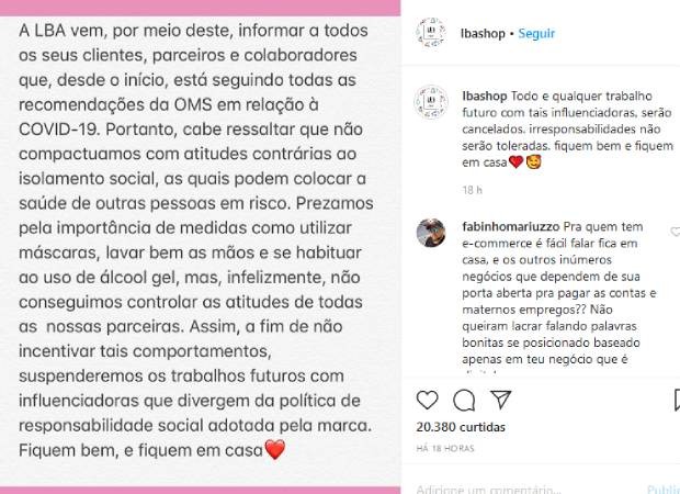 "Nos inteiramos de toda a situação e resolvemos suspender a parceria com a influenciadora. Ressaltamos qe não concordamos de forma alguma com o que houve e deixamos claro que sempre seguimos todas as recomendações da OMS no combate ao Covid-19", declarou a marca.
