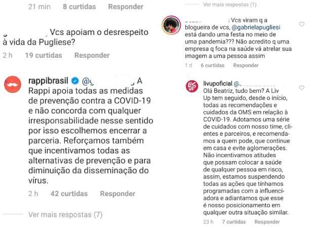 "A Liv Up tem seguido, desde o início, todas as recomendações e cuidados da OMS [Organização Mundial da Saúde] em relação à Covid-19. Adotamos uma série de cuidados com nosso time, clientes e parceiros, e recomendamos a quem pode que continue em casa e evite aglomerações. Não incentivamos atitudes que possam colocar a saúde de qualquer pessoa em risco, assim, estamos suspendendo todas as ações que tínhamos programadas com a influenciadora e adiantamos que esse é nosso posicionamento em qualquer outra situação similar", informou a Liv Up.