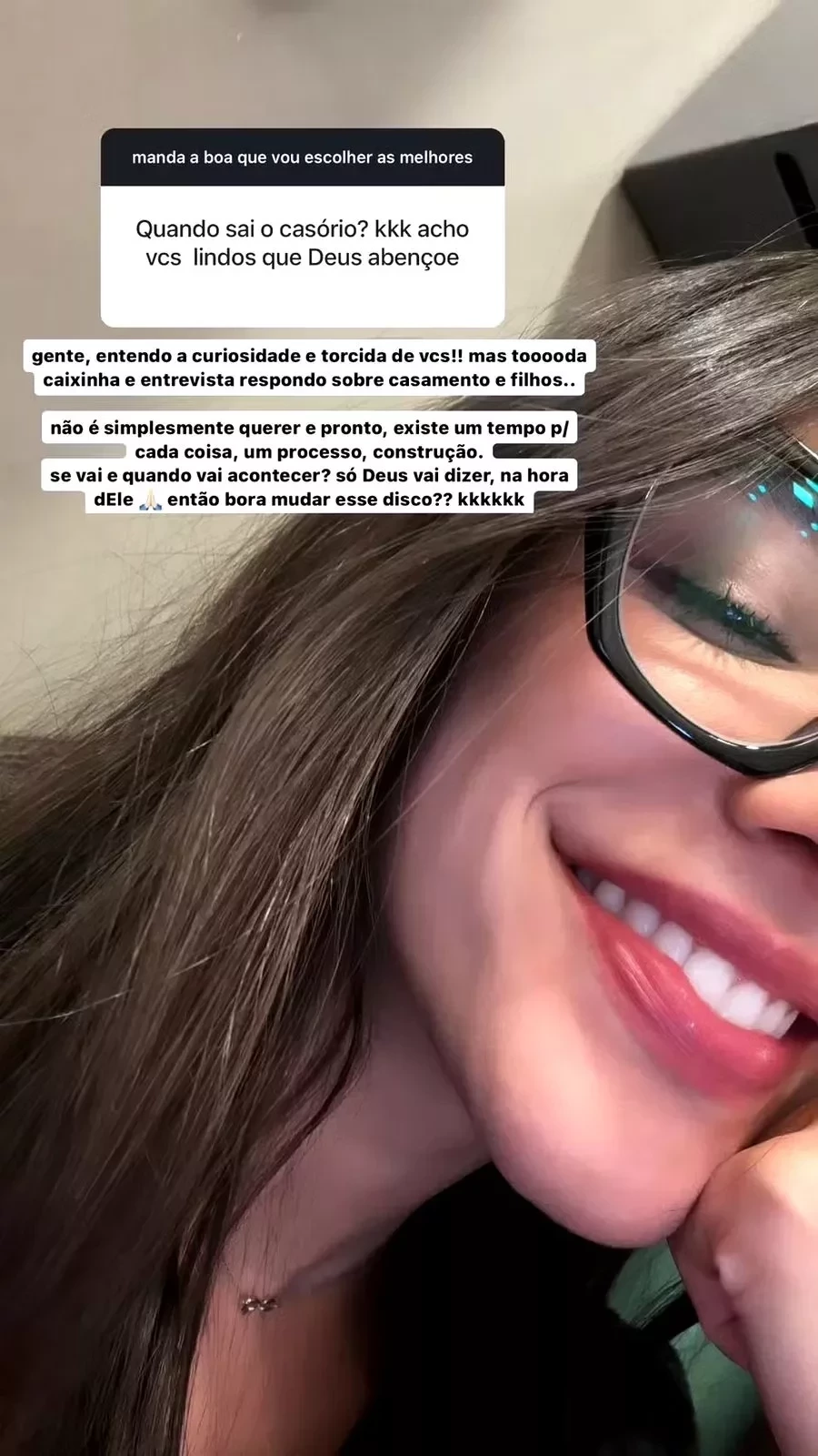 Em resposta, a influenciadora expressou compreensão pela curiosidade e torcida dos seguidores, mas destacou que assuntos como casamento e filhos envolvem um processo e um tempo específicos. Ela enfatizou que esses eventos ocorrerão, se for o caso, no tempo certo, e sugeriu que os seguidores mudassem o foco das perguntas.