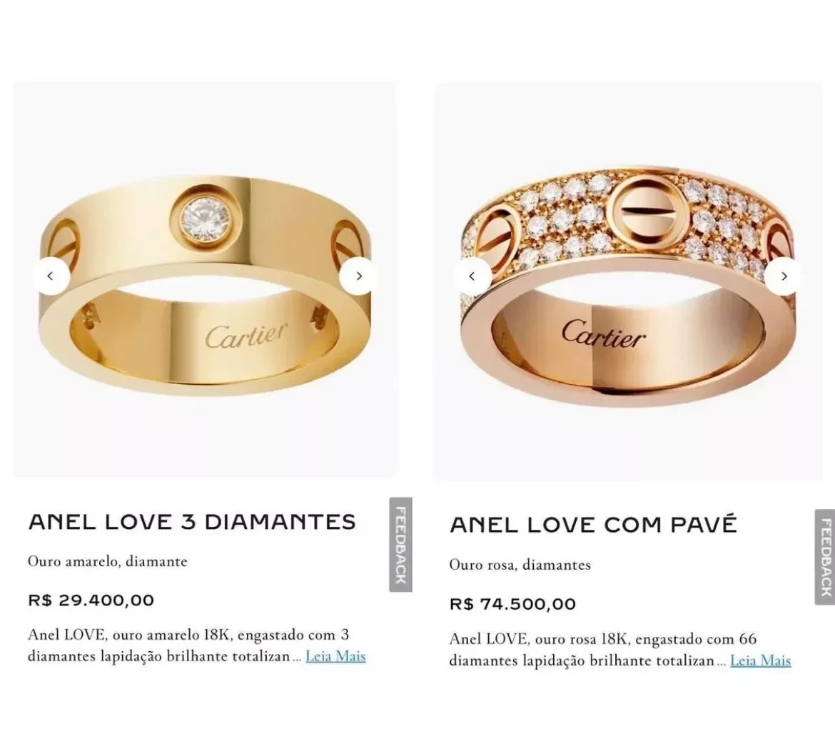 A primeira joia é uma aliança em ouro amarelo 18K, a peça tem seu valor estimado em cerca de R$9 mil. A segunda é um modelo de aliança feita em ouro rosa 18K e é toda adornada com 66 diamantes. A peça é avaliada em aproximadamente R$75 mil. Combinadas, as duas joias totalizam cerca de R$85 mil.