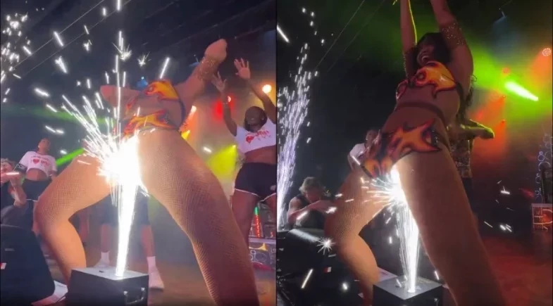 Durante a apresentação, Gaby chega perto do equipamento de frente e depois de costas, sendo atingida pelas faíscas na região do figurino. O momento foi registrado em vídeo e rapidamente circulou nas redes sociais.
