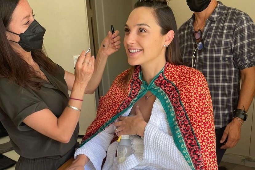 Gal Gadot, atriz que vive a Mulher-Maravilha no cinema, compartilhou com os seguidores uma foto tirando leite com uma bombinha enquanto é maquiada nos bastidores de um novo trabalho.