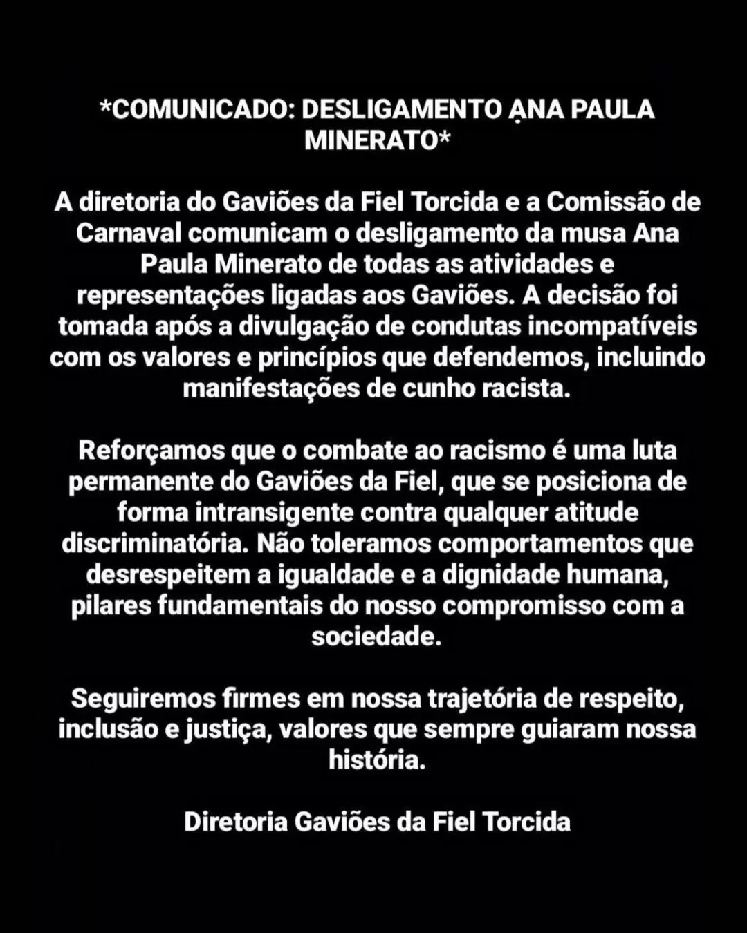Após a divulgação de um áudio, supostamente contendo declarações preconceituosas e creditado a Minerato, a escola de samba anunciou por meio de nota oficial o afastamento da influenciadora de qualquer função ou representação associada aos Gaviões