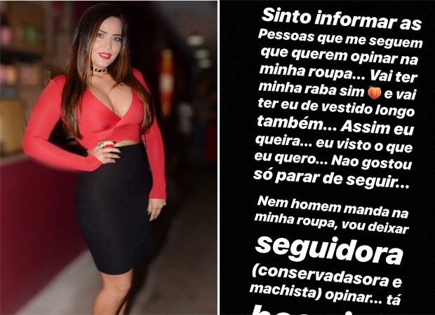 "Sinto informar as pessoas que me seguem que querem opinar em minha roupa... Vai ter minha raba sim, e vai ter eu de vestido longo também... Assim eu queira... Eu visto o que eu quero, não gostou é só parar de seguir", começou ela.