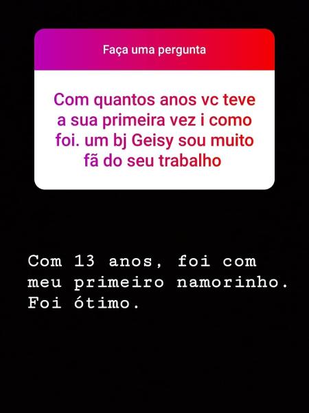 Geisy Arruda revelou, na terça-feira (21), ao responder perguntas de seguidores nos stories do Instagram, que perdeu a virgindade com 13 anos. Na conversa com fãs, ela também falou sobre a vontade de ficar com mulheres e os comentários em suas fotos ousadas. Ao ser questionada sobre sua primeira vez, a influenciadora respondeu: "[Foi] com 13 anos. Foi no meu primeiro namorinho. Foi ótimo". As informações são do UOL.