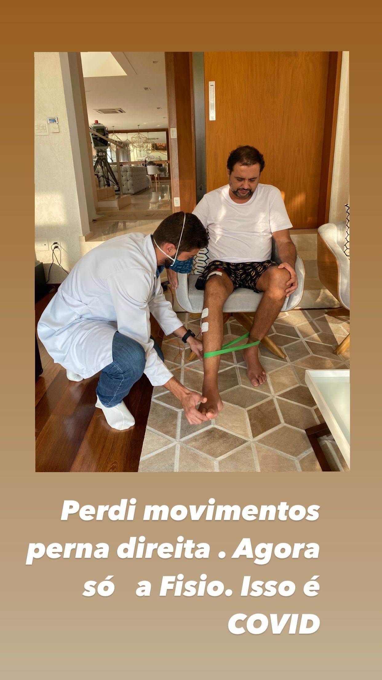"Agora só a fisioterapia. Isso é Covid", escreveu Geraldo, ao compartilhar uma foto em que aparece fazendo exercícios com um médico.