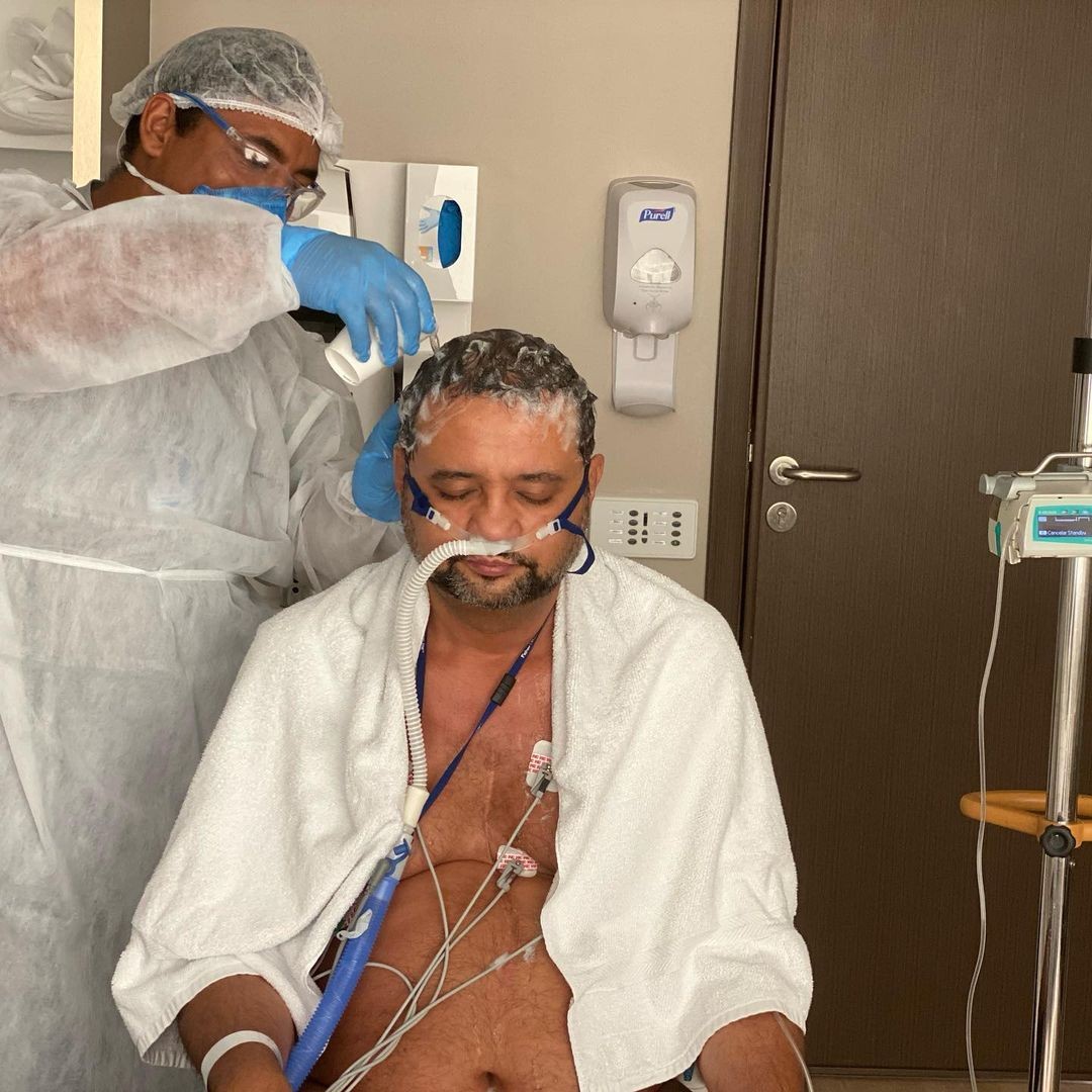 "Só quem passou ou irá passar saberá! Eu sobrevivi à Covid-19. Sempre fui um ser humano que cresceu aprendendo a dar valor no mínimo. Mas, de repente, vem a vida e lhe tira de cena, você passa a não ter mais nada, sua fragilidade vai ao extremo. Esse da foto é meu herói, o enfermeiro Marcio do Hospital Vila Nova Star. Com ele aprendi a reviver na cama.
