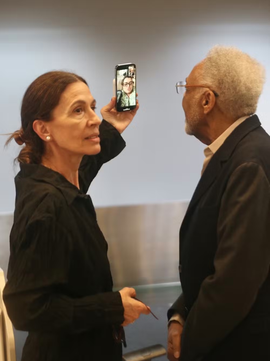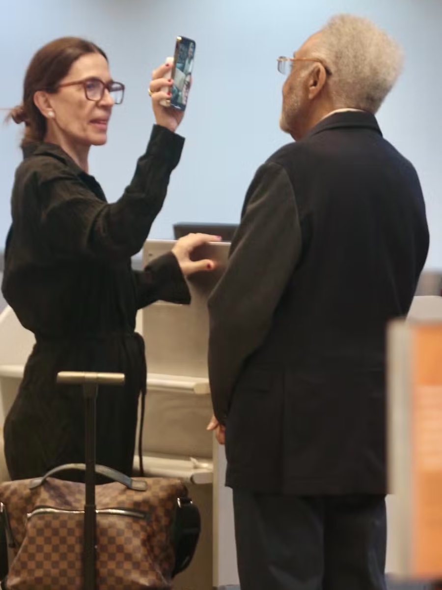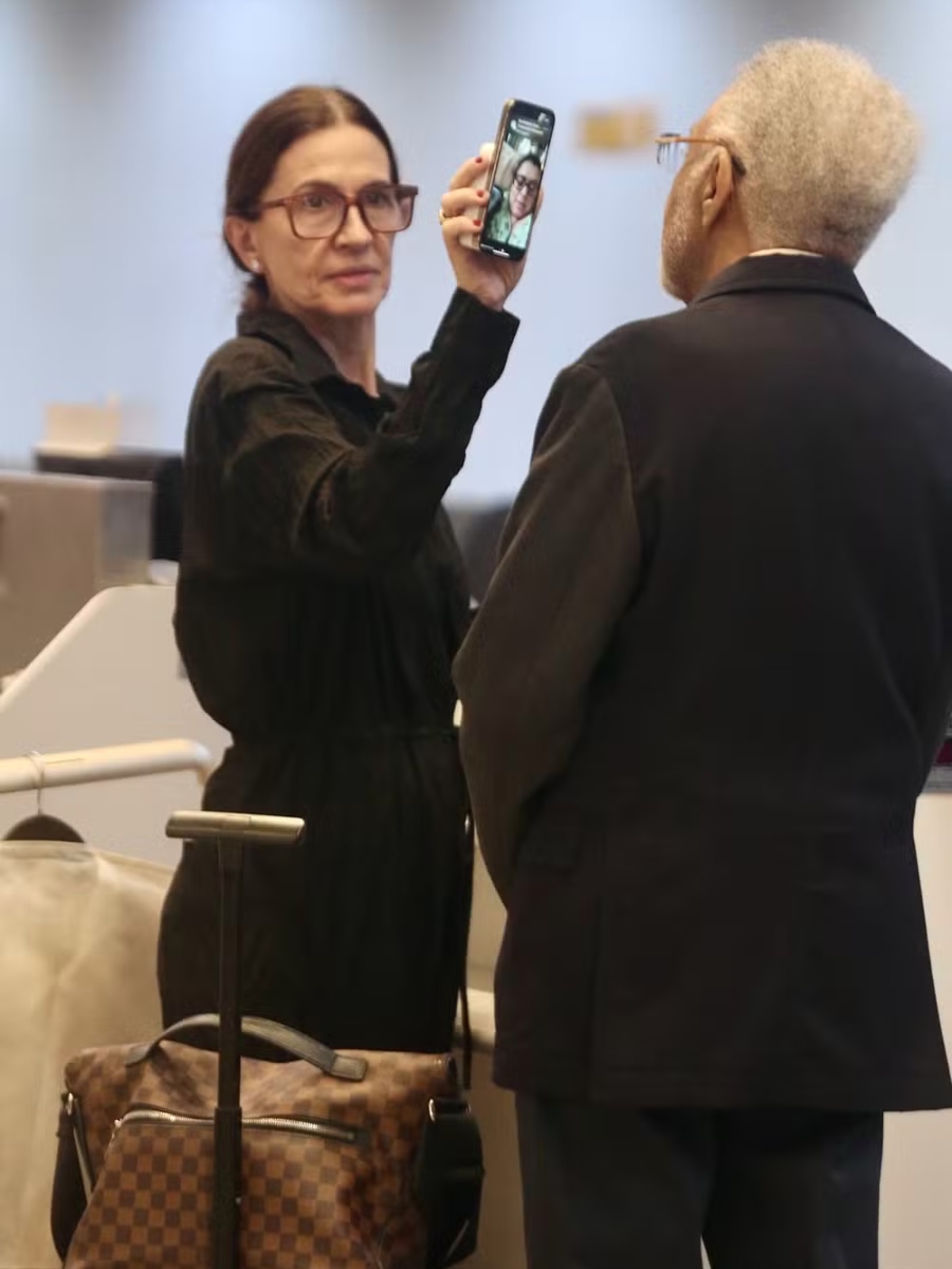 Gilberto Gil e Flora Gil foram fotografados nesta quinta-feira (22) no aeroporto Santos Dumont, no Rio de Janeiro. Enquanto aguardavam, o casal protagonizou um momento de carinho ao fazer uma videochamada com a filha Preta Gil, que está em Nova York, nos Estados Unidos, onde realiza um tratamento experimental contra o câncer colorretal.