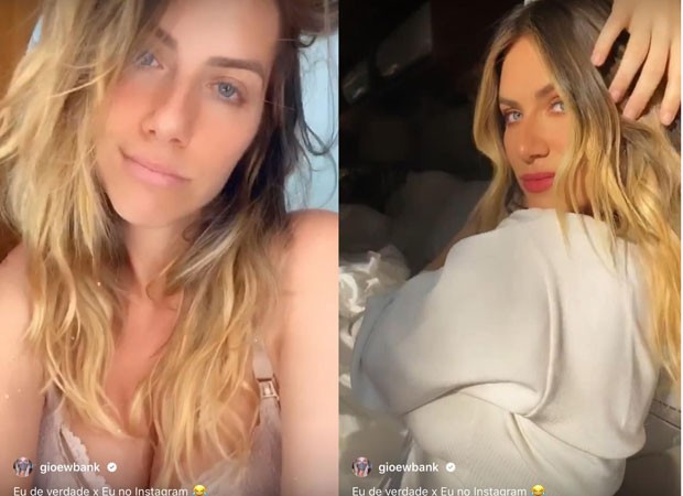 Giovanna Ewbank, de 34 anos, tirou este sábado (19) para exibir sua beleza na internet. Usando o recurso Reels, que permite vídeos de até 15 segundos, a atriz e apresentadora mostrou como é "de verdade e no Instagram". Bruno Gagliasso, seu marido, se divertiu com a comparação e se derreteu. "kkkkkkk te amo", escreveu ele.