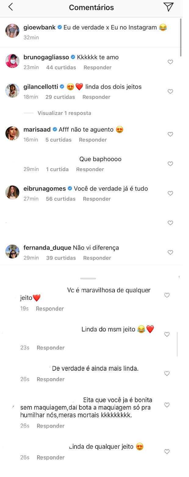 A "comparação" foi suficiente para fazer os fãs encherem a caixa de comentários com elogios. "Já é bonita sem maquiagem, daí bota a maquiagem só para humilhar os meros mortais", escreveu um seguidor. "Linda de qualquer jeito", apontaram diversos outros.