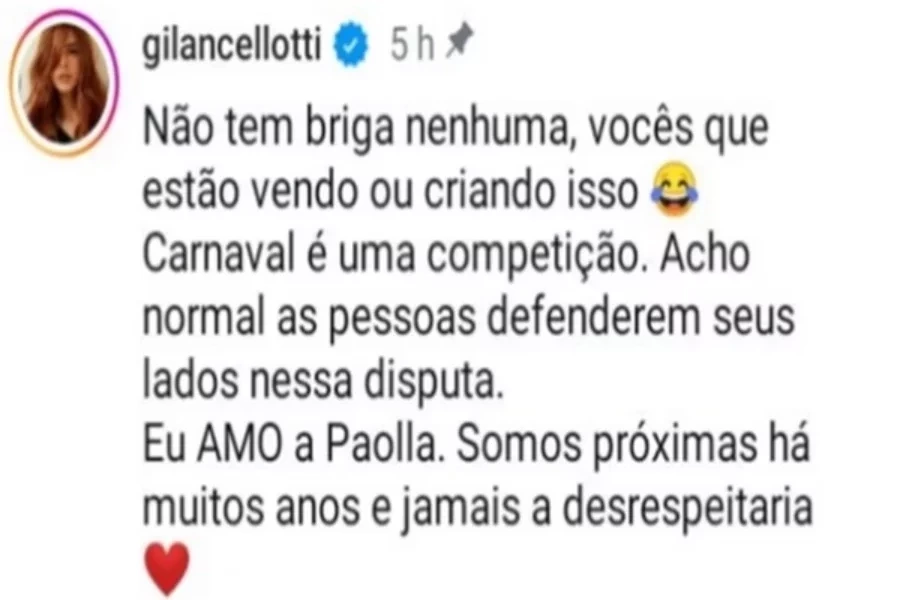 “Não tem briga nenhuma, vocês que estão vendo ou criando isso. Carnaval é uma competição. Acho normal as pessoas defenderem seus lados nessa disputa. Eu amo a Paolla e jamais a desrespeitaria”, garantiu, na página Segue a Cami, no Instagram.
