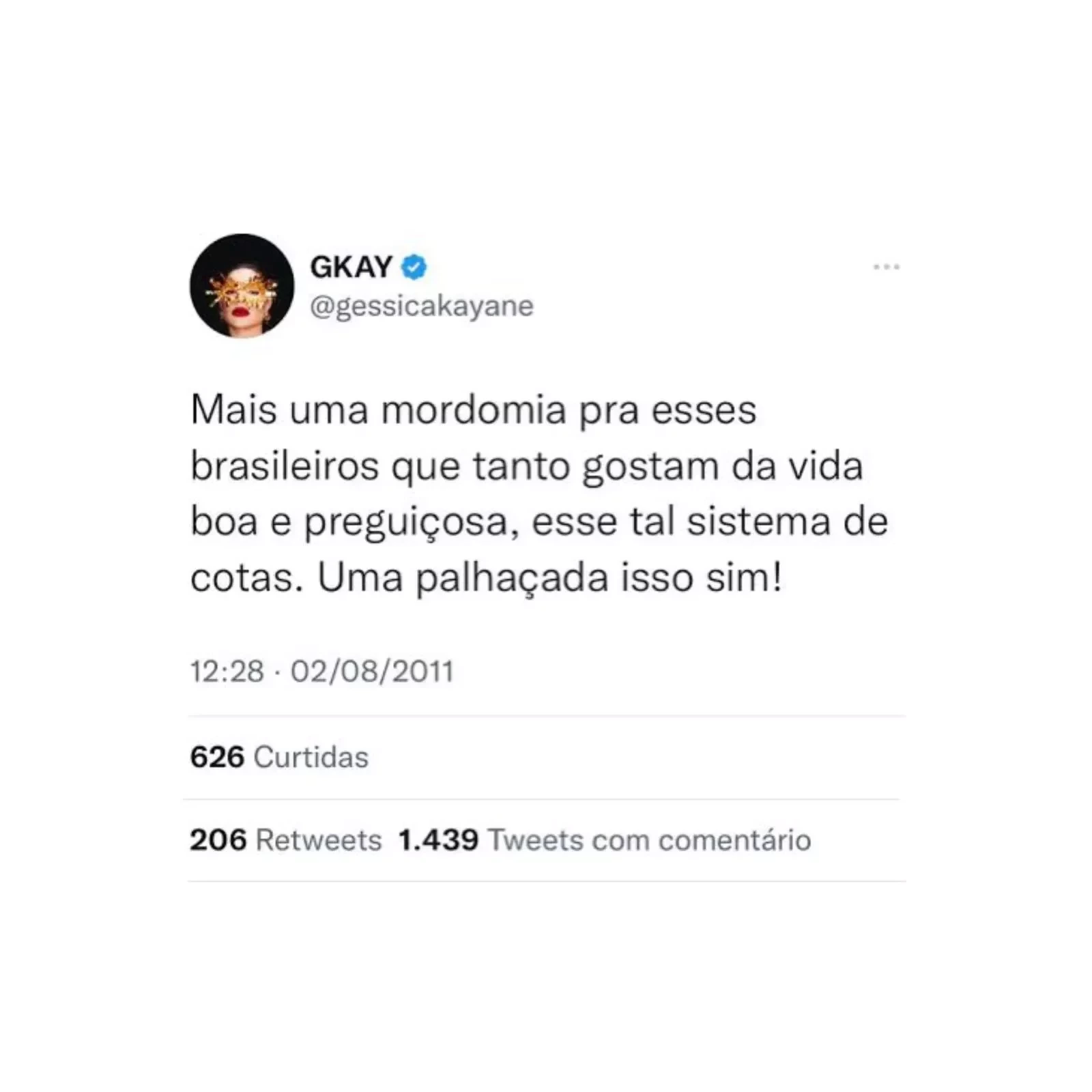 A publicação em questão foi feita em 2011, cerca de 13 anos atrás. Na mensagem publicada, a humorista criticou o sistema de cotas: “Mais uma mordomia pra esses brasileiros que tanto gostam da vida boa e preguiçosa, esse tal de sistema de cotas. Uma palhaçada isso sim!”, disparou a famosa.