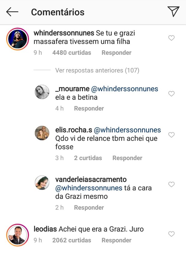 "Nossa, por um momento achei que fosse a Grazi Massafera!", disse uma fã. Outros, foram além: "Está a cópia". Até colegas famosos da influenciadora digital, como Whindersson Nunes, repararam na semelhança. "Se tu e Grazi Massafera tivessem uma filha", brincou o comediante.