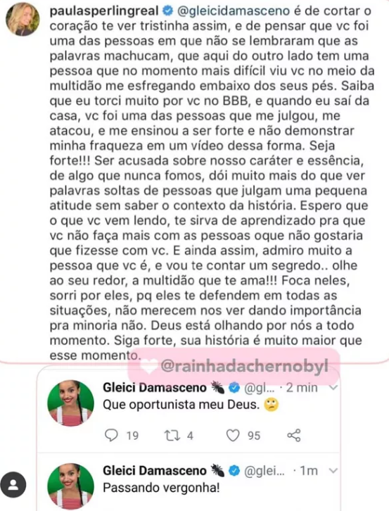 Diante do comentário da rival, Gleici foi ao Twitter e disparou pesadas críticas. “Passando vergonha. Que oportunista, meu Deus”. Nos Stories, ela completou: “Não tem como você ter empatia por alguém que é racista, que sabe que é racista, que não se arrepende dos seus atos racistas. Só se eu fosse racista. Do meu entendimento, não tem como ter empatia com quem é homofóbico. Tem que ter empatia com quem sofre homofobia”, falou a ex-BBB, que criticou vitória de Paula no BBB19.