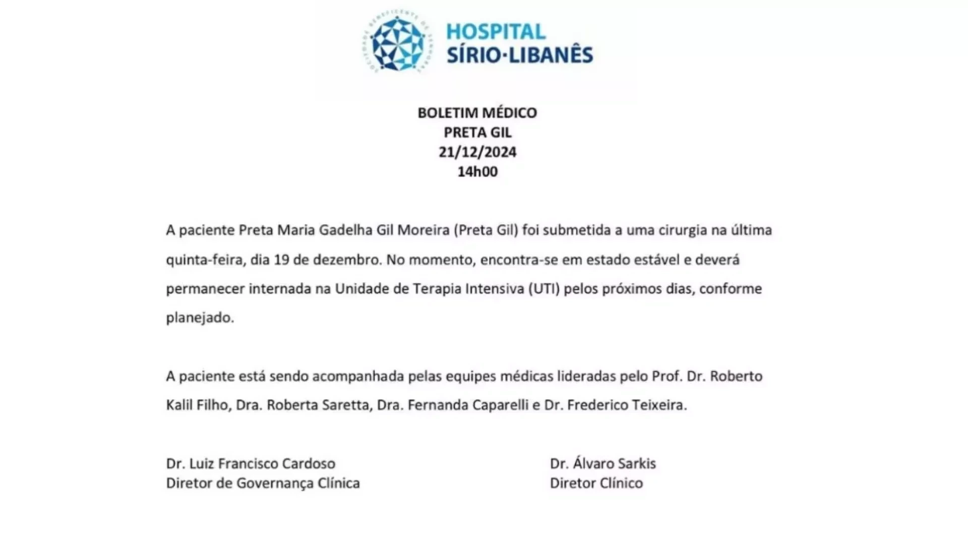 No sábado (21), a equipe médica de Preta emitiu a seguinte nota: "A paciente Preta Maria Gadelha Gil Moreira (Preta Gil) foi submetida a uma cirurgia, na última quinta-feira, dia 19 de dezembro. No momento, encontra-se em estado estável e deverá permanecer internada na Unidade de Terapia Intensiva (UTI) pelos próximos dias, conforme planejado. A paciente está sendo acompanhada pelas médicas lideradas pelo Professor Doutor Roberto Kalil Filho, Dra. Roberta Saretta, Dra. Fernanda Caparelli e Dr. Frederico Teixeira", dizia o comunicado.